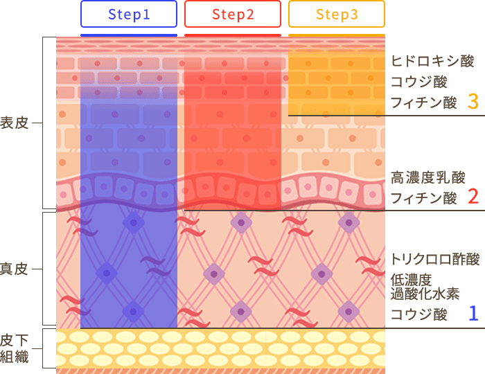 リバースピールは、3本の薬剤を順番に使い、真皮層から表皮浅層に向けて肝斑や色素沈着にアプローチし、改善していきます。